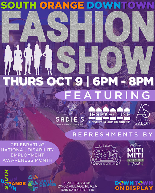 The South Orange Downtown Fashion Show returns to Spiotta Park on Thursday, October 9 from 6:00–8:00 PM, kicking off Disability Employment Awareness Month with an inspiring evening of style and community. Now in its fourth year, the runway will feature models from JESPY House, showcasing the latest looks from Sadie’s and creations by Artistry by Ampy Salon, with small bites and refreshments from Three Daughters Baking Co. and Miti Miti, plus a cash bar for 21+ benefiting JESPY House. This celebration not only highlights fashion but also shines a light on the contributions of the JESPY community, many of whom are proudly employed by local businesses, reinforcing the value of inclusion and independence in the workplace. Presented as part of Downtown on Display, a series of unique events that spotlight South Orange’s small businesses. Free admission. Learn more at southorangedowntown.org/events-calendar/fashion-show. Rain date: Friday, October 10 from 6:00–8:00 PM.