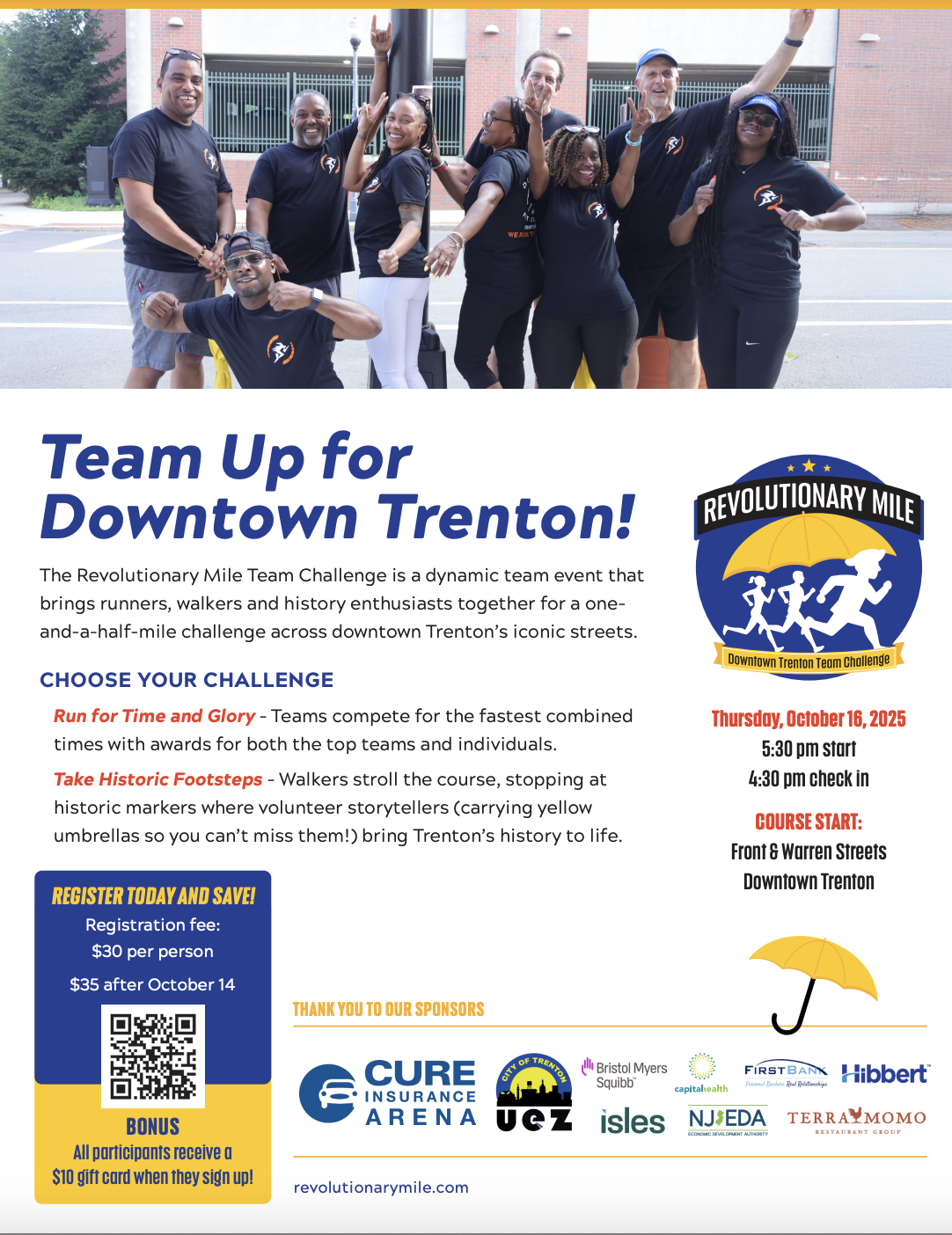 The Revolutionary Mile Team Challenge is a dynamic team event that brings runners, walkers and history enthusiasts together for a one- and-a-half-mile challenge across downtown Trenton’s iconic streets.