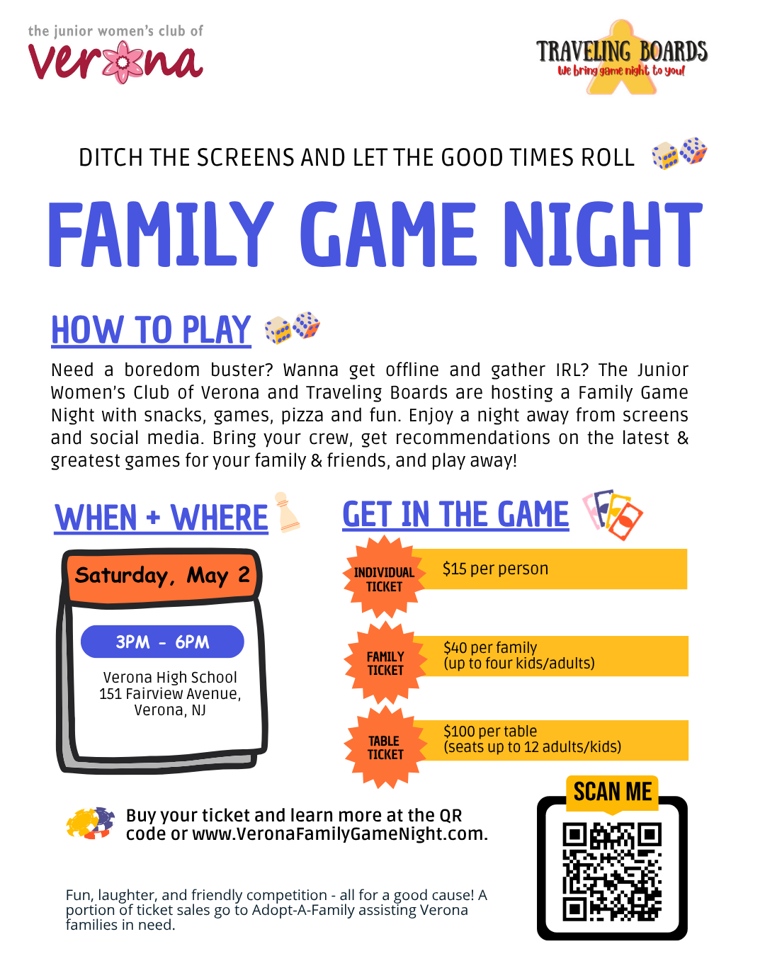 The Junior Women’s Club of Verona is teaming up with local NJ business Traveling Boards to host a Family Game Night on Saturday, May 2 at 3PM. Looking for a…