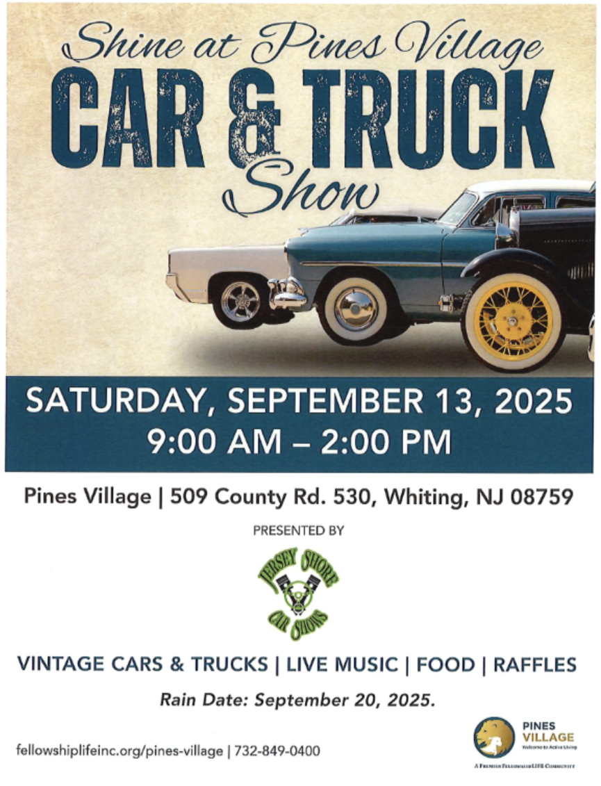 Pines Village 509 County Road 530, Manchester Township, NJ, United StatesJoin the Pines Village Life Plan Community for their second annual Shine at the Pines Car & Truck Show with Jersey Shore Car Shows. The open and free to the…