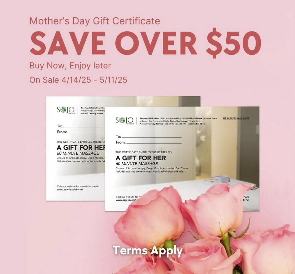 Give the mom(s) in your life something to look forward to this Mother’s Day. At SoJo Spa Club, grab a gift certificate that saves you over $50 and includes a 60-minute massage, complimentary daily admission to SoJo Spa Club and complimentary valet parking. This is the perfect way to treat her to a relaxing spa day.
