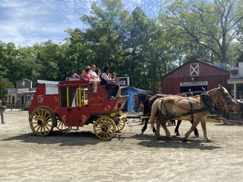 Besides the live-action shows and history, there are a few rides. My kids loved saddling up to go on a real pony merry-go-round ride. Next, we took the train ride, also known as the Ol’ 97, right into the badlands of Wild West City. This train ride was unlike anything we’d ever been on—we rode right into outlaw territory. The ten-minute train ride went through a tunnel, and we saw an exciting show right from our seats. The excitement continued up until we departed from the train. We then boarded a stagecoach ride on the Wild West City Stage Line. Two horses pulled the stagecoach, and it traveled to the outskirts of town, but don’t expect it to be a quick ride—there are some surprises on the way. The pony, train, and stagecoach rides are all available for an extra fee.